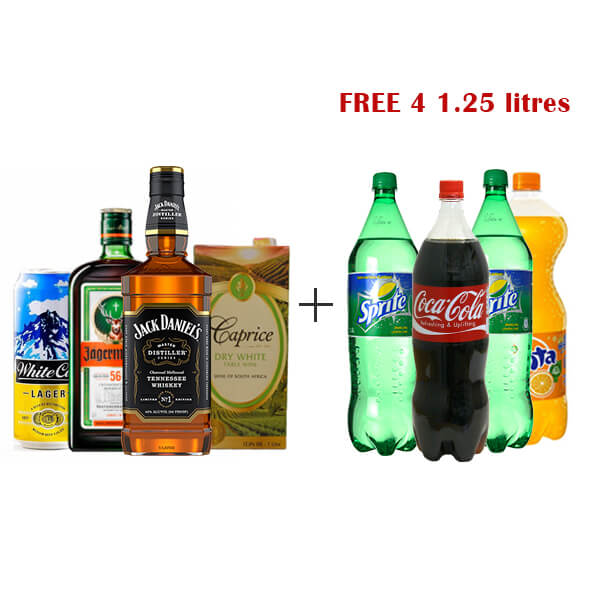 White Cap Lager can 500ml, Jagermeister Liqueur 700ml , Jack Daniel’s Tennessee Whiskey 700ml, 2 Caprice Dry white 1L wine + 4 FREE 1.25 litres of Soda